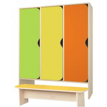 Шкаф для детской одежды 3-ех местный с банкеткой предназначен для организации пространства для отдыха детей в детском саду.